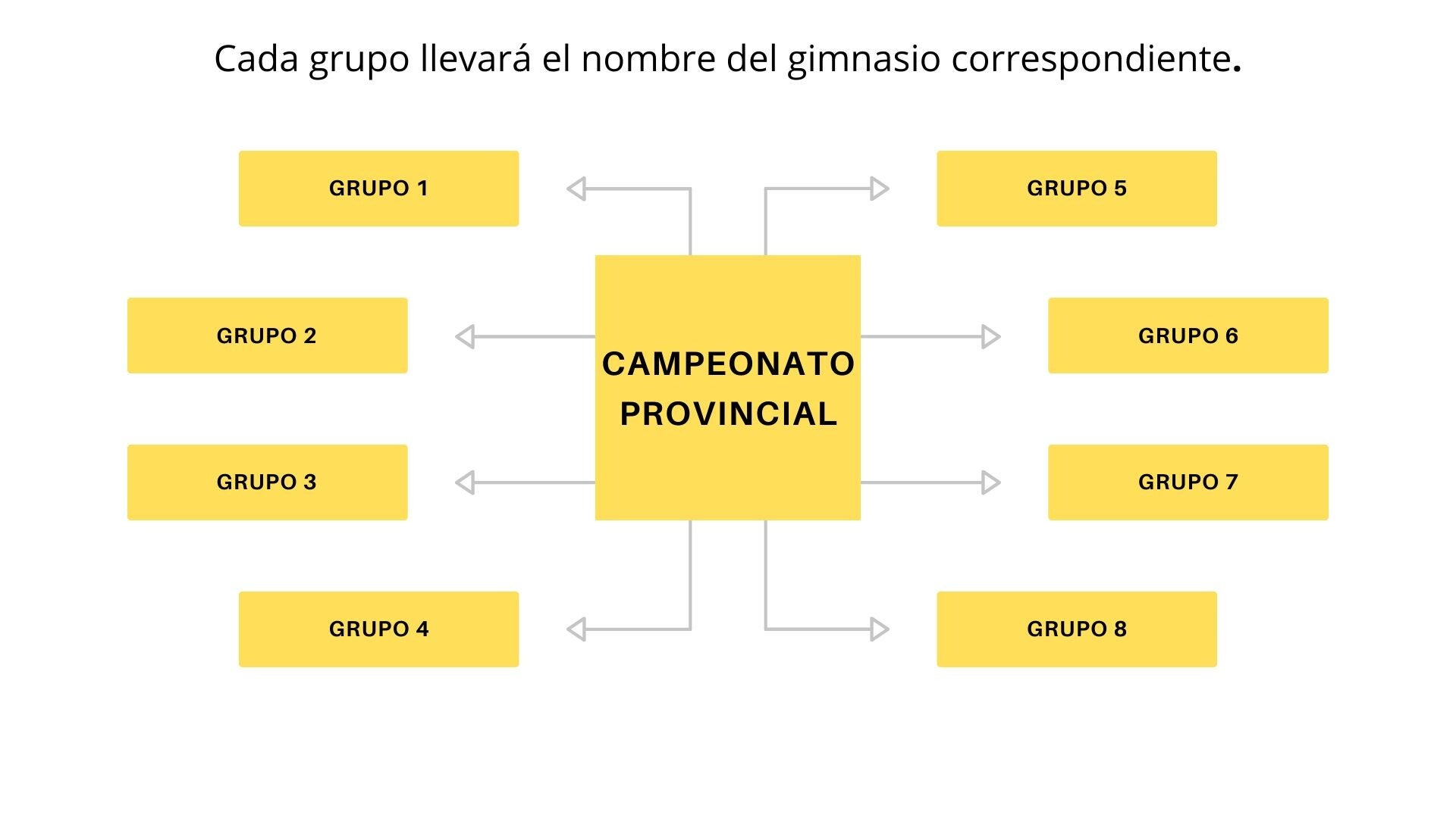 El Campeonato provincial está formado por grupos de 4 o 6 corredores de un mismo gimnasio y se desarrolla en 2 fases: